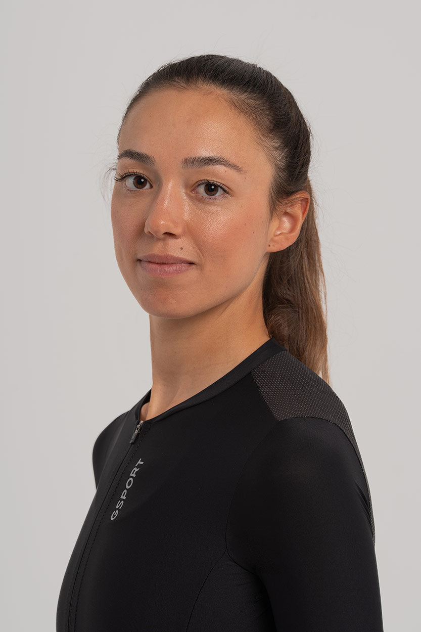 Está compuesto por dos tejidos: uno liso en la parte frontal, laterales y mangas; y un tejido microperforado en la espalda y bolsillos. Lo que lo convierte en un maillot altamente transpirable y de secado rápido.