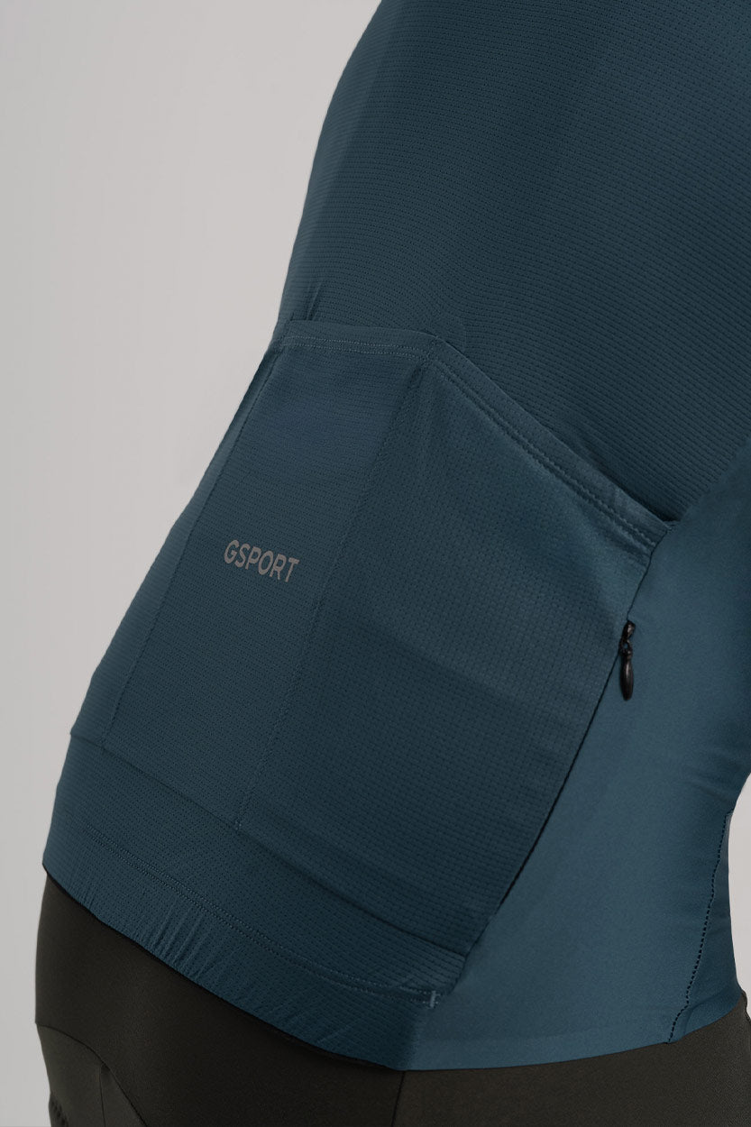 Está compuesto por dos tejidos: uno liso en la parte frontal, laterales y mangas; y un tejido microperforado en la espalda y bolsillos. Lo que lo convierte en un maillot altamente transpirable y de secado rápido.