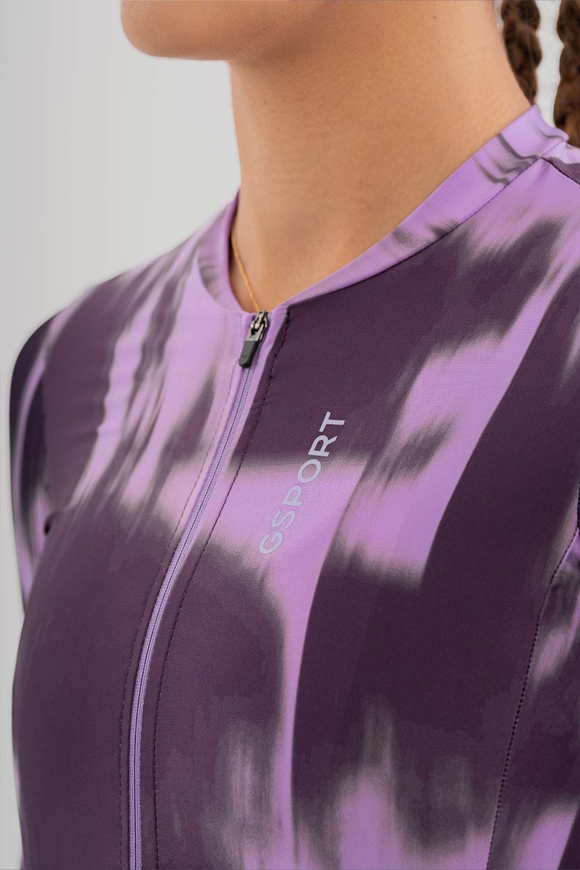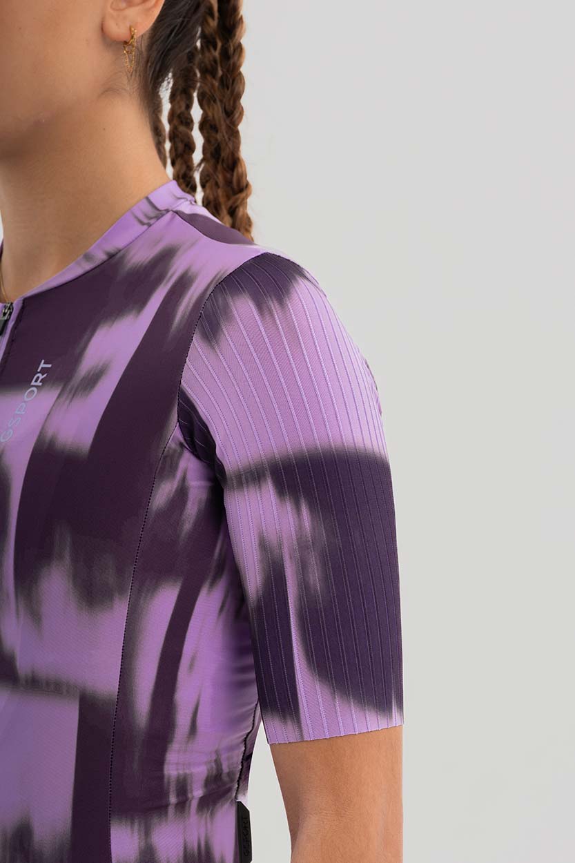 Está compuesto por tres tejidos ligeros: un tejido liso en la parte frontal y laterales, un tejido listado en mangas (que aporta el toque aerodinámico a la prenda) y un tejido microperforado en la espalda y bolsillos. Esta combinación de tejidos lo convierte en un maillot altamente transpirable y de secado rápido.