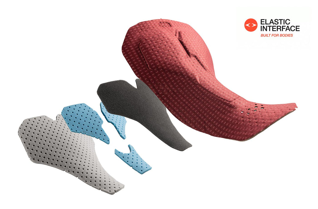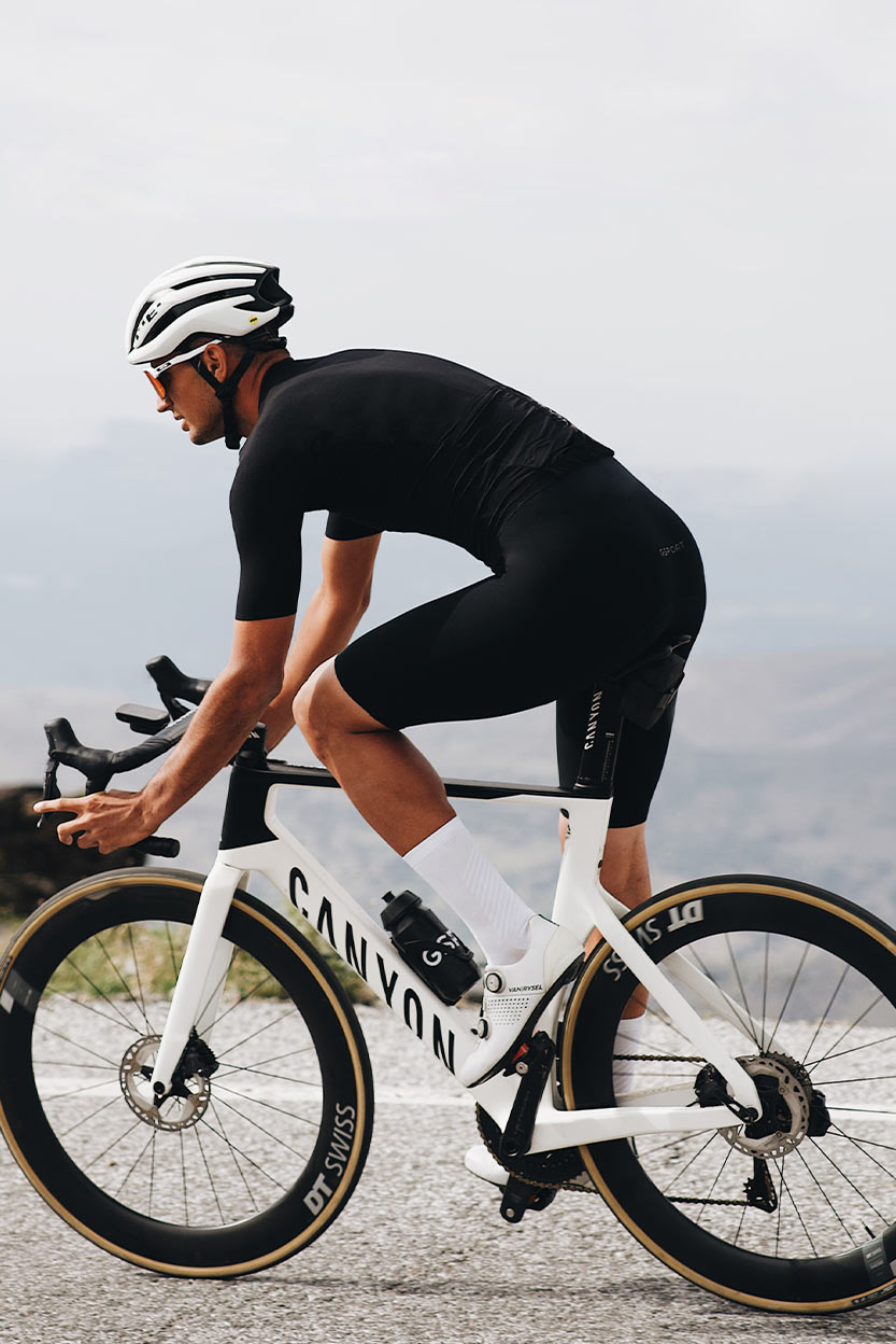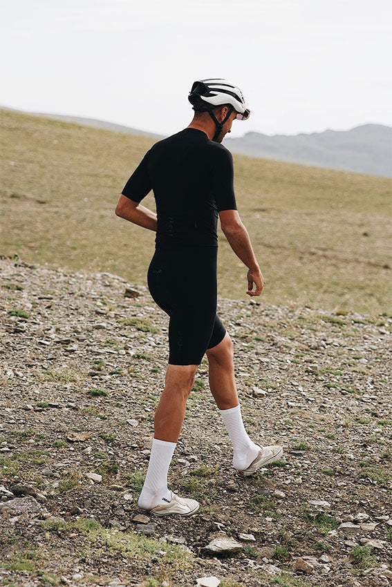 These bib shorts do not have cuffs; instead, they feature a fabric with integrated Gripper technology on the inside, which allows for finishing the end of the garment, providing optimal grip and preventing the shorts from moving. Laser-cut braces with customized Gsport elastic tape. Elastic Interface chamois recommended for long distances, a hybrid ultradistance model developed in a sustainable fabric with cooling and quick-drying properties.