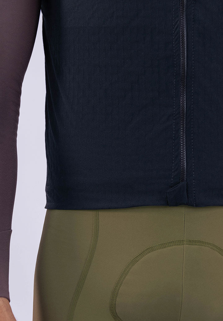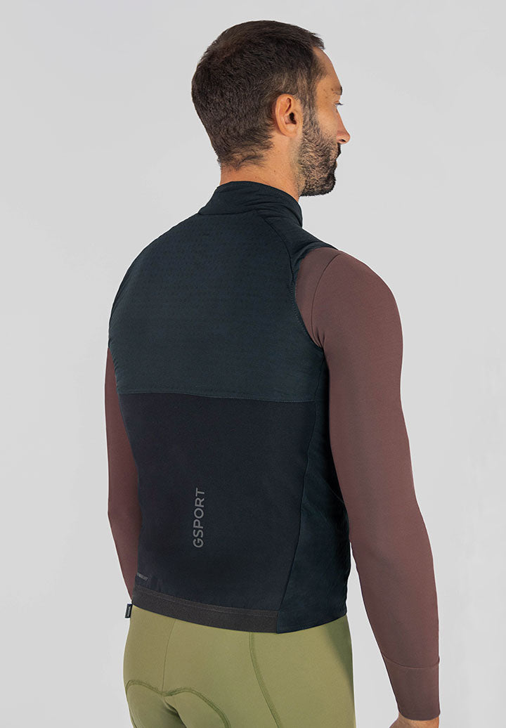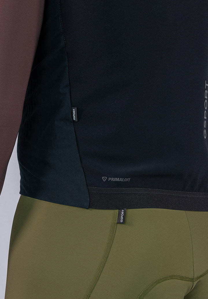 Lightweight, double-layer insulated gilet. It is a lightweight and breathable windproof garment. The outer shell is made of windproof, highly breathable and stretchable Jacquard fabric. The inside is lined with a thermo-regulating, quick-drying Primaloft® fabric that helps keep the body dry during sport, while providing extra warmth. Semi-automatic YKK Vislon® double slider zip. Reflective details.